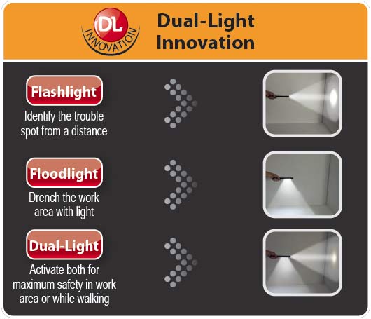 Dual–Light INNOVATION combines a separate flood light with a flashlight in a single housing. The floodlight spreads light over an area four times broader than a flashlight beam with no hot spots that impair visibility while searching or working.
