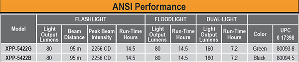 The XPP–5422 is designed with super bright LEDs that produce exceptionally powerful white light for its size. Two push-button switches control the momentary or constant flashlight and the floodlight. Activate both for maximum illumination and safety while working or ob the move.