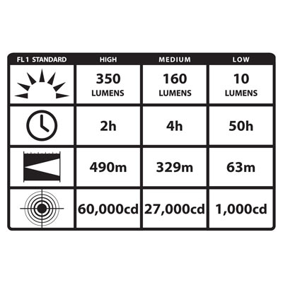 High – 60,000 candela peak beam intensity, 350 Lumens, 2 hour runtime