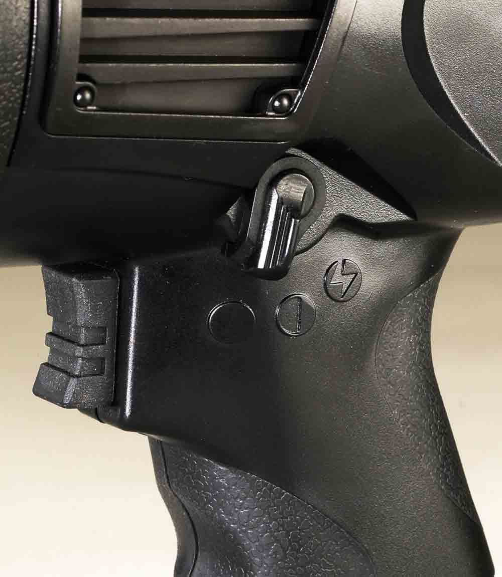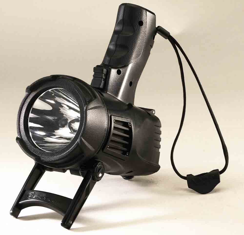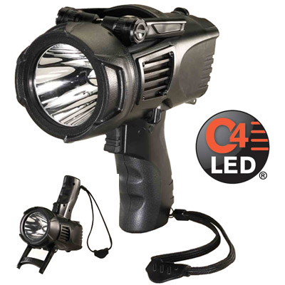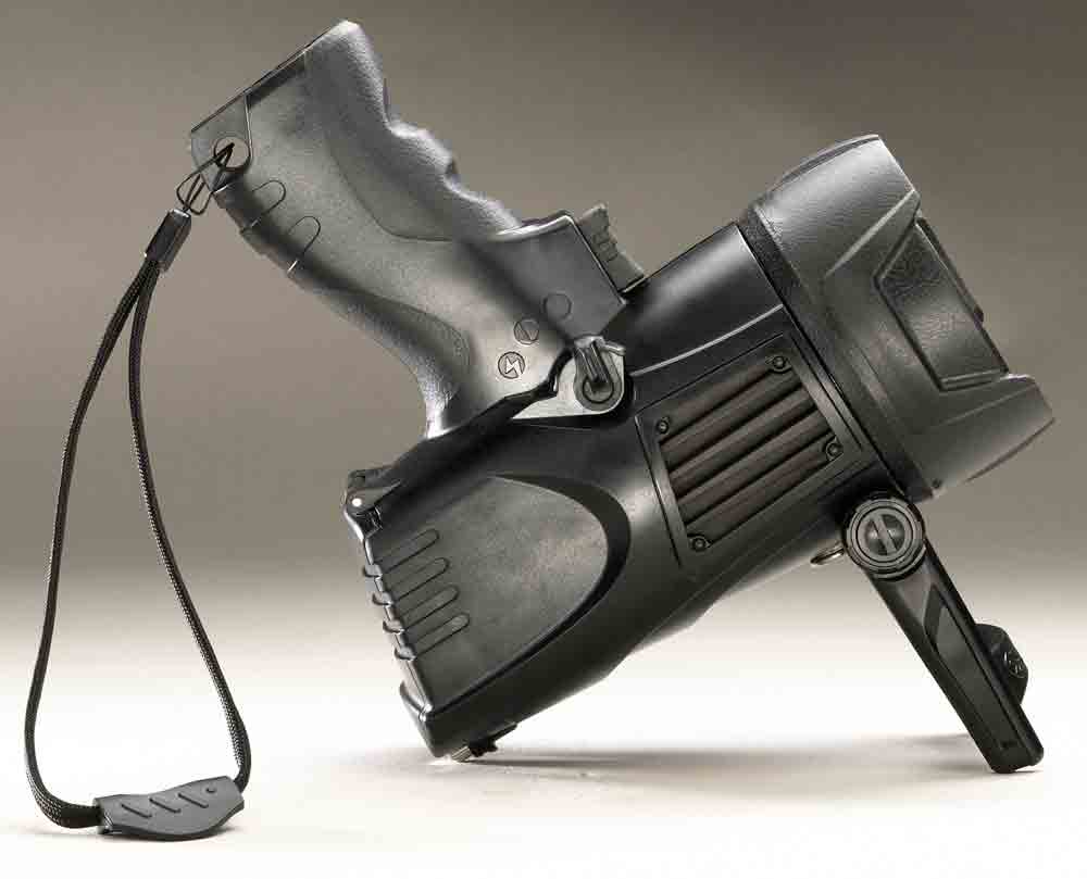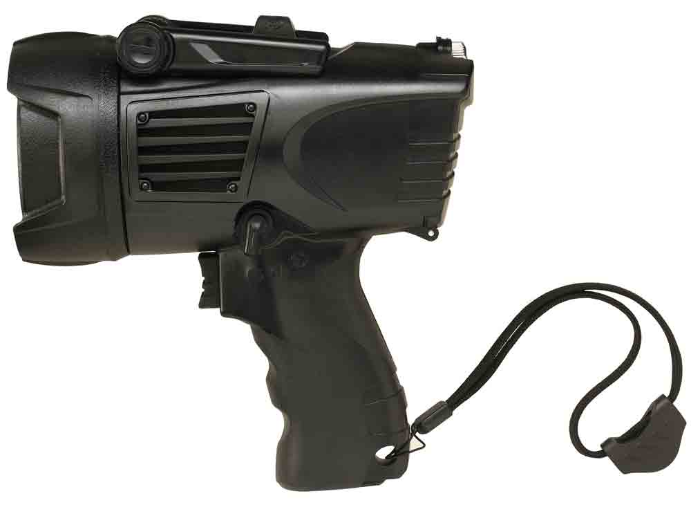 Pistol-grip spotlight features 3 modes: High, low, strobe