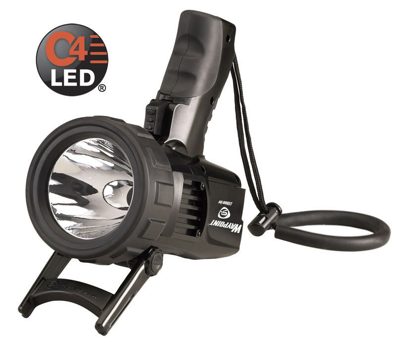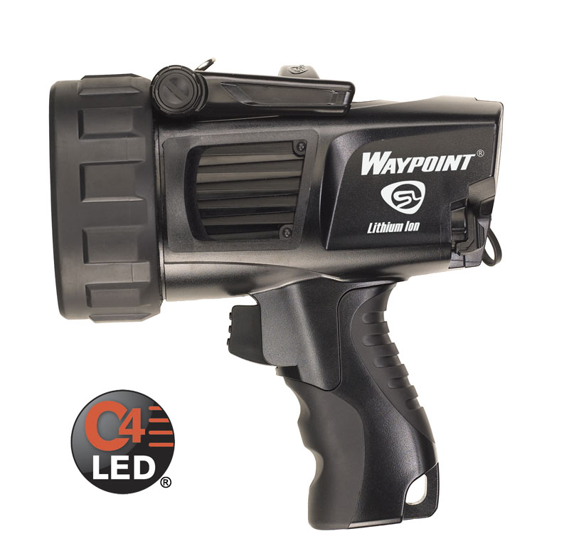 Pistol-grip spotlight features 3 modes: High, Medium, Low