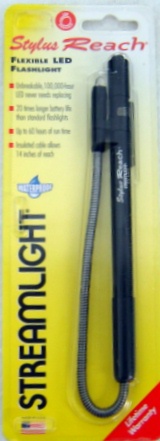 The Stylus Reach from Streamlight. An Ultra-slim, waterproof pen light that features a flexible cable extension with a high intensity L.E.D. on the end. The flexible cable allows for 14" of reach. Momentary or constant-on switch with lifetime warranty. Machined aluminum case comes with non-slip grip, pocket clip & the flexible cable insulated with PVC. Runs up to 60 hours on 3 "AAAA" batteries (included).