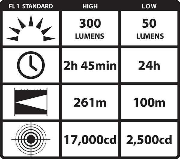 High: 300 lumens; 17,000 candela; runs 2.75 hours