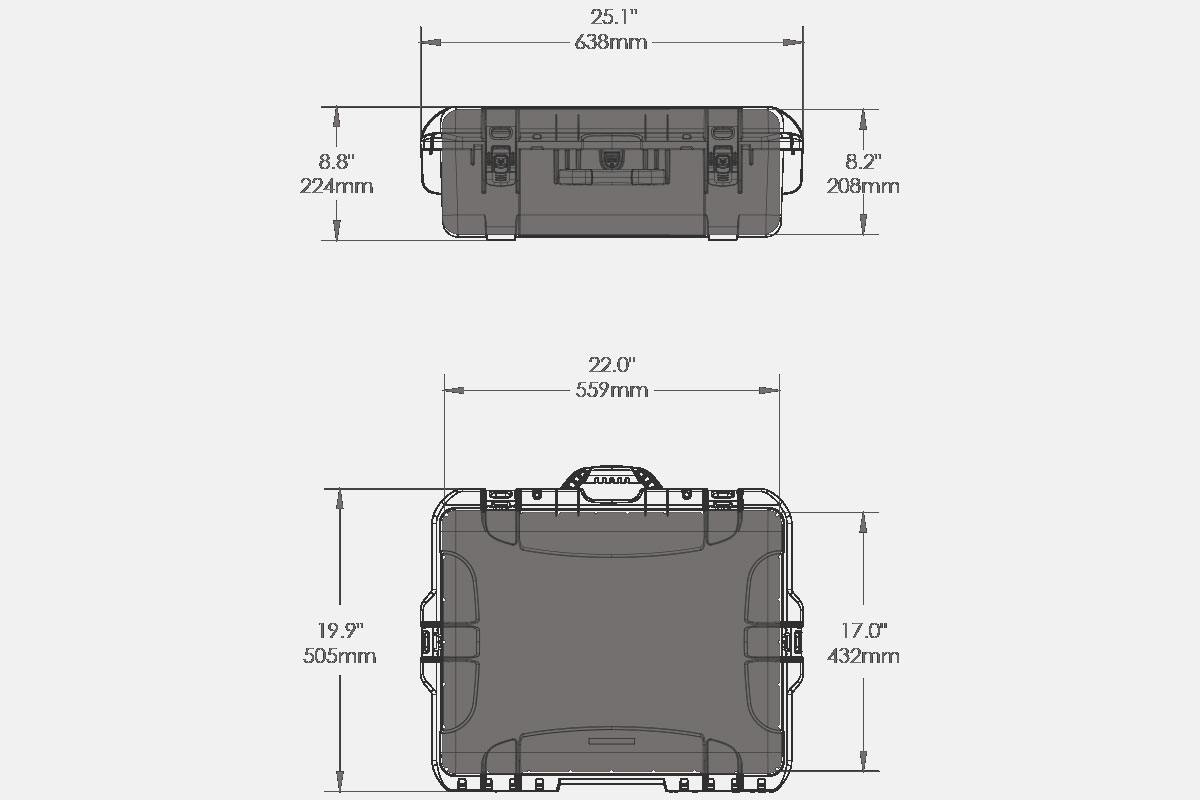 Exterior dimensions L25.1″ x W19.9″ x H8.8″ - L638mm x W505mm x H224mm
