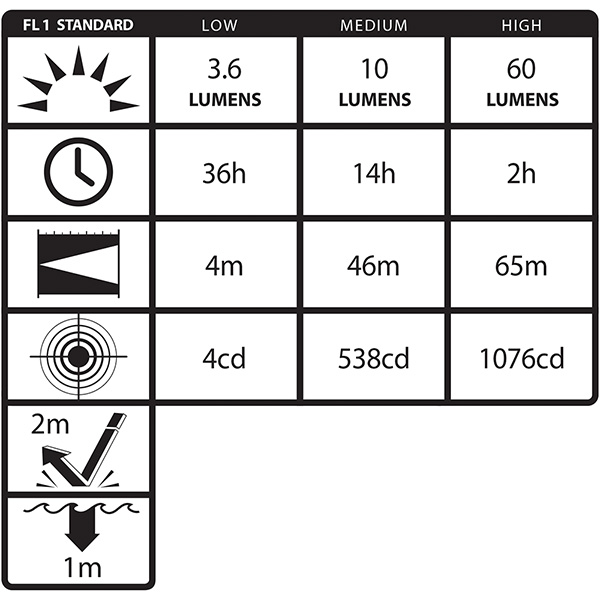 Specifications: UPC: 017398803755 Flashlight Lumens: 3.6 / 10 / 60 Beam Distance: 4 / 46 / 65 m Candela: 4 / 538 / 1,076 Drop Rating: 2 m Water Rating: IP-X7 Flashlight Run-time: 36 / 14 / 2 Type of Switch: Single Tail Cap Switch - Momentary or Constant-on Flashlight, Low, Medium and High-Brightness Flashlight Light Source: LED Case Material: Aircraft-grade 6061-T6 Aluminum w/Type III Hard Anodized Finish Body Color: Blue Battery Quantity: 1 Power Source: AA Primary Batteries Length: 4 in (102 mm) Handle Diameter: 0.6 in (15 mm) Head Diameter: 0.9 in (23 mm) Weight: 2.2 oz (62 g) Package Contents: Light, 1 AA battery and Removable pocket clip Warranty: Limited Lifetime