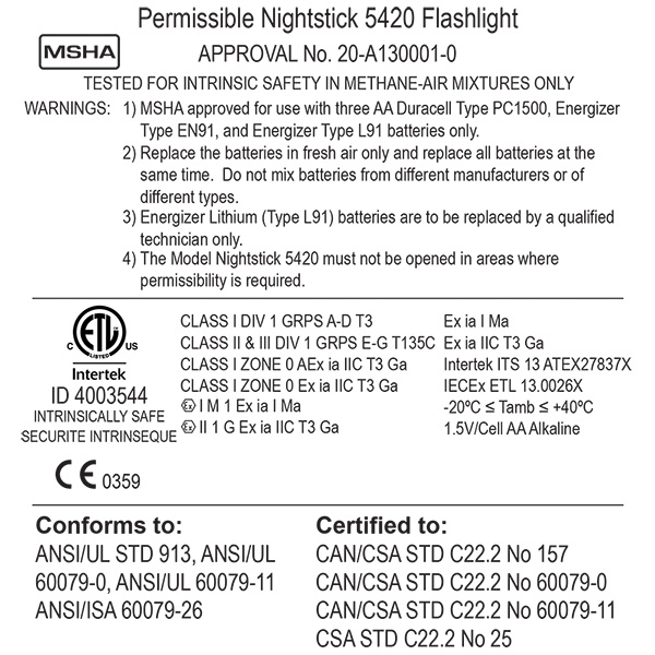 The NIGHTSTICK™ XPP–5420 series flashlight is the perfect lighting tool for hazardous work place environments and is listed intrinsically safe for use in environments of Class I II III Div 1 Groups A,B,C,D,E,F,G, brilliant flashlight beam, light weight and 14.5 hour run–time. The oval shape fits in any size hand and the spring pocket-clip makes it easy to carry and ready for work.