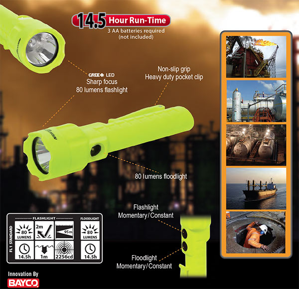 Equipped with Bayco’s exclusive DL INNOVATION™ featuring Flashlight • Floodlight • Dual-Light capability the XPP–5422 series makes conventional intrinsically safe lights obsolete.